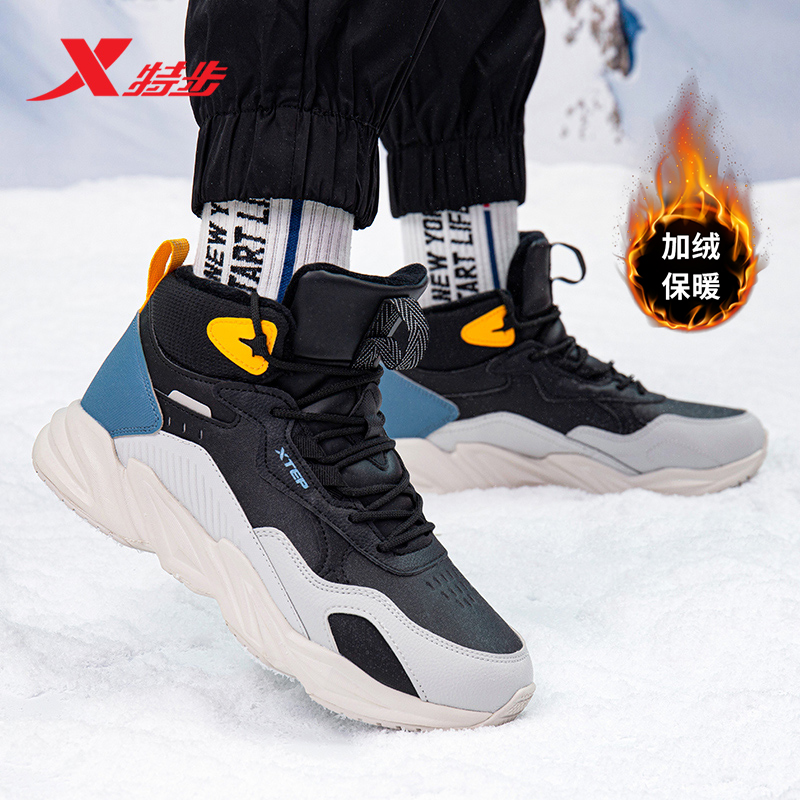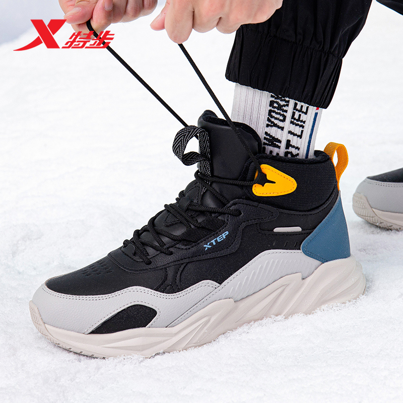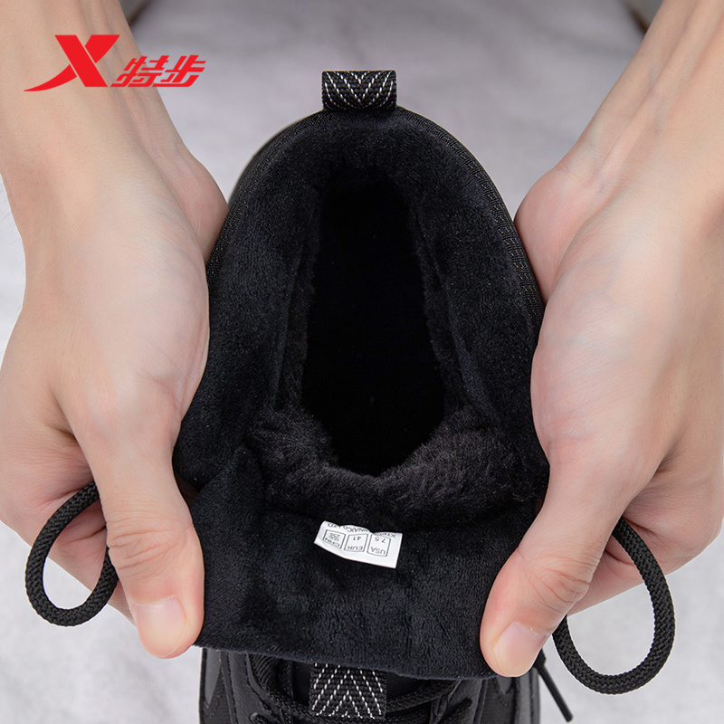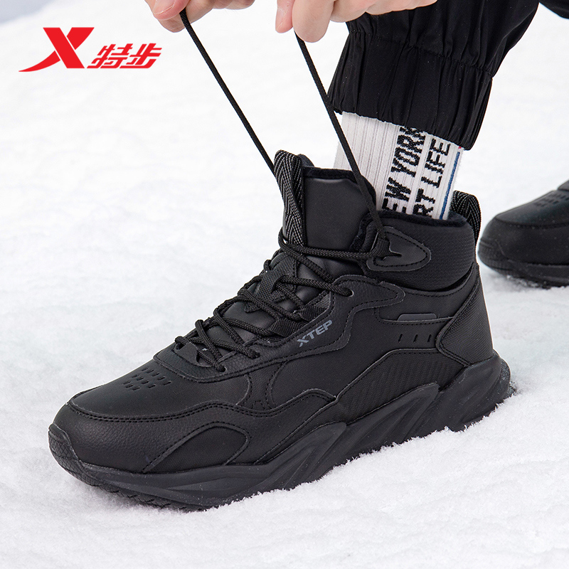 棉鞋 高帮皮面黑色轻便运动鞋 2025冬季 加绒保暖休闲鞋 新款 特步男鞋