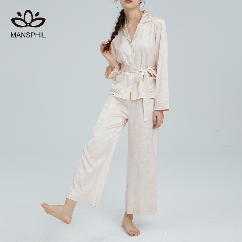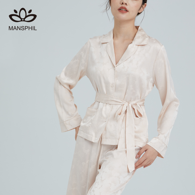 春秋桑蚕丝睡衣套装 晨袍 两件套真丝睡袍可外穿家居服女丝绸长裤