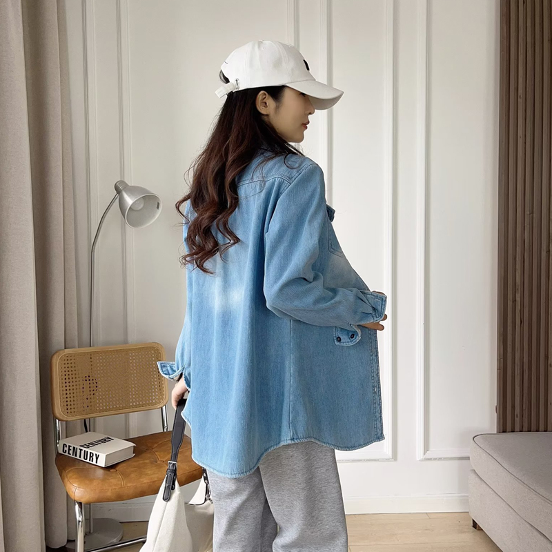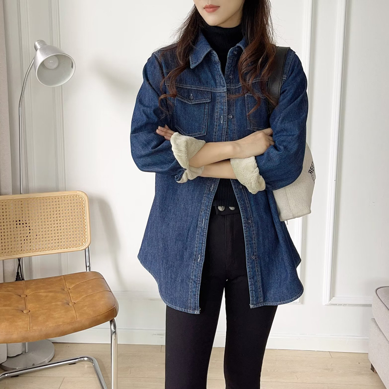 宽松叠穿加厚宽松上衣外套 小众设计感韩版 加绒牛仔衬衫 女秋冬新款