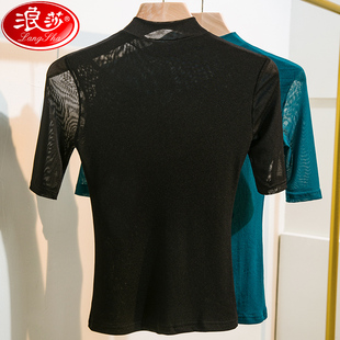 修身 立领双层网纱T恤女五分袖 女装 上衣中袖 浪莎2025秋季 小衫 新款