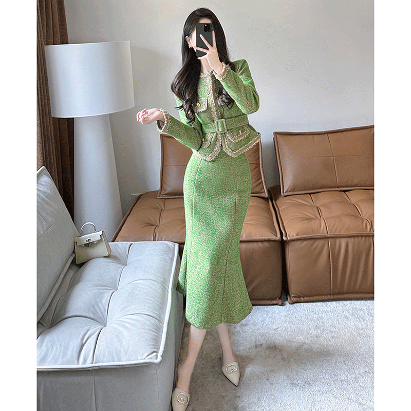 显瘦两件套装 气质绿色高级感修身 潮 裙2025秋冬新款 韩系小香风套装