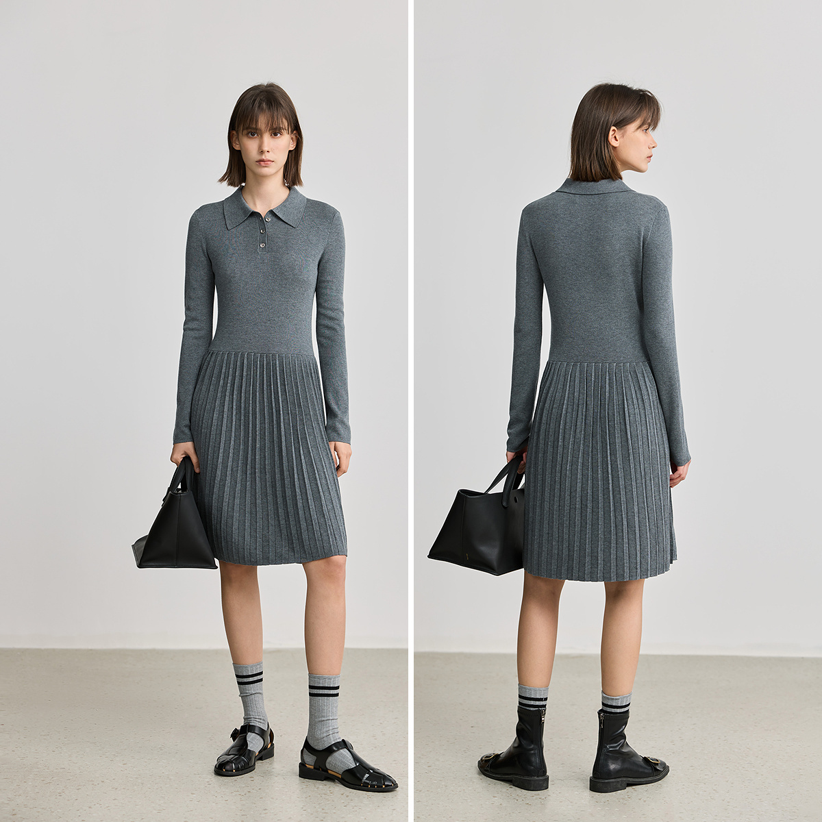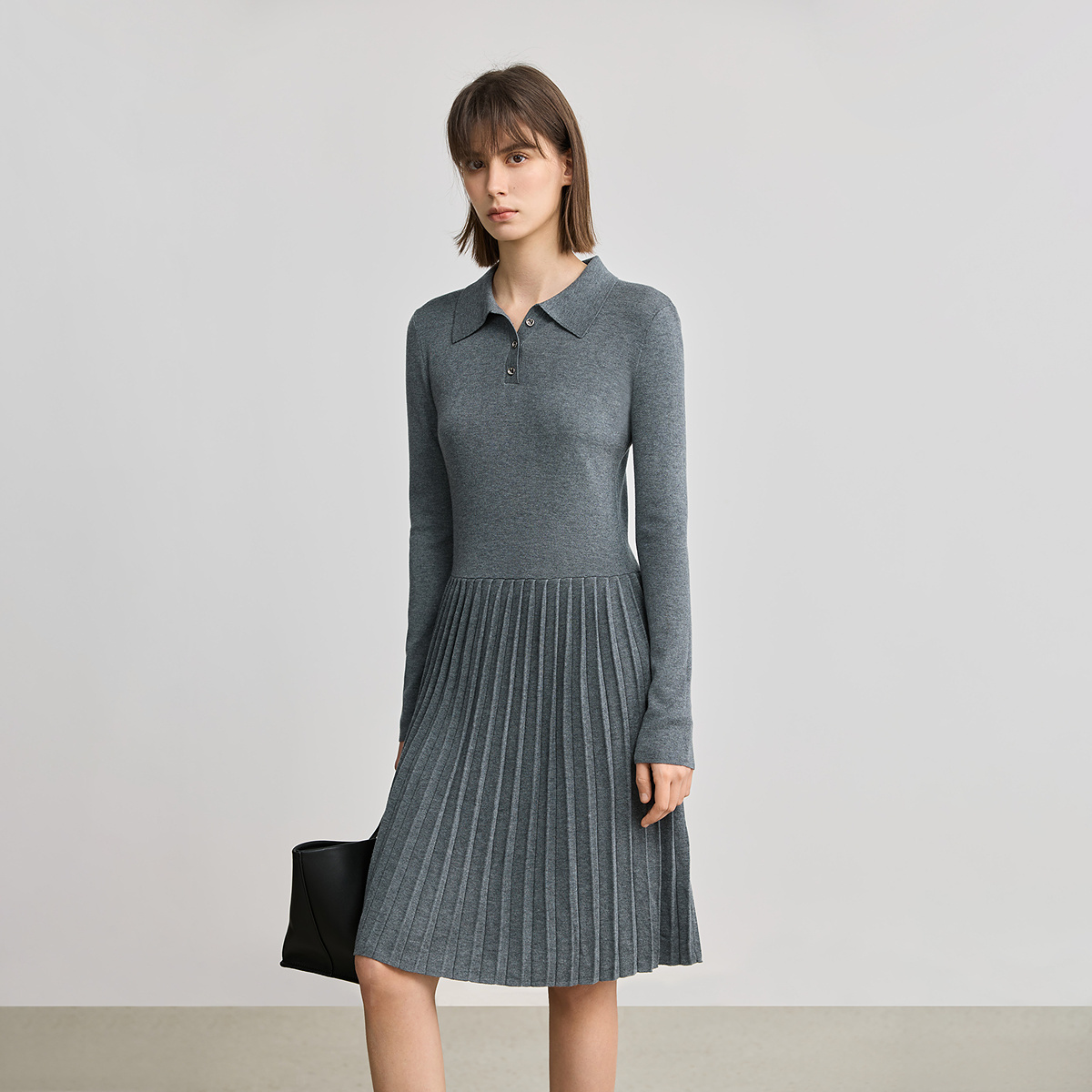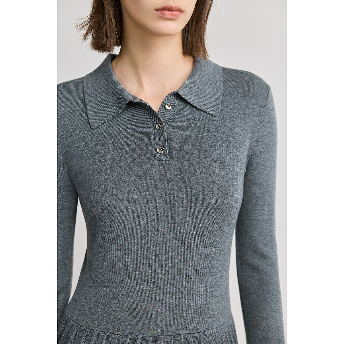 LILY2025格雷系POLO领修身 弹力垂感百褶裙灰色连衣裙针织裙女