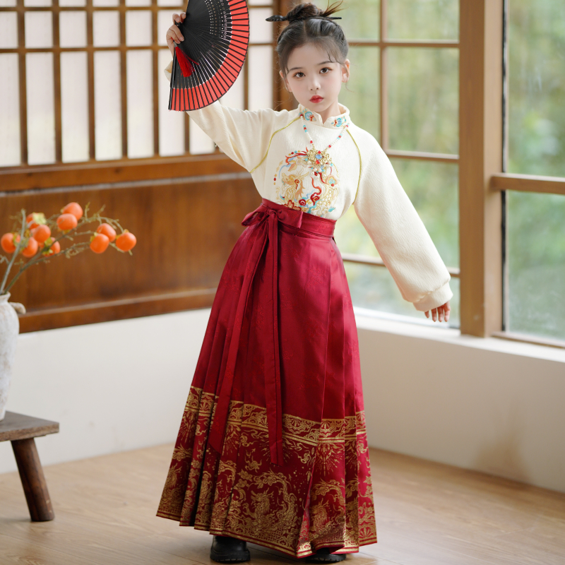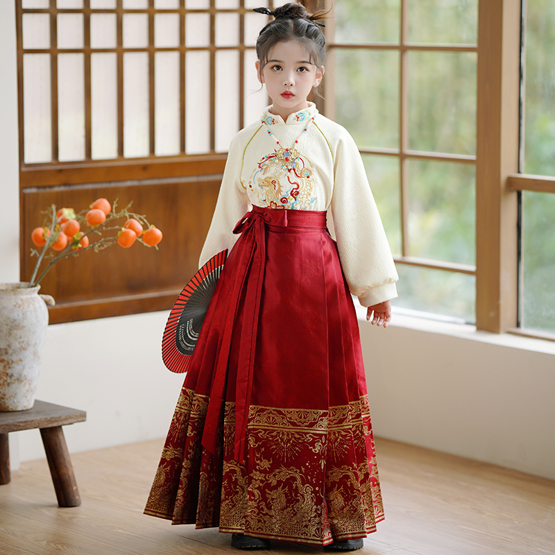 红色古装 国风加绒上衣儿童新中式 汉服中大童冬 套装 马面裙女童秋季