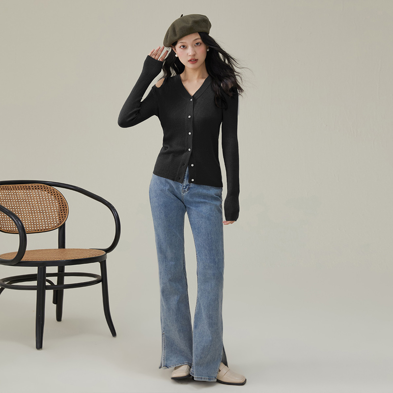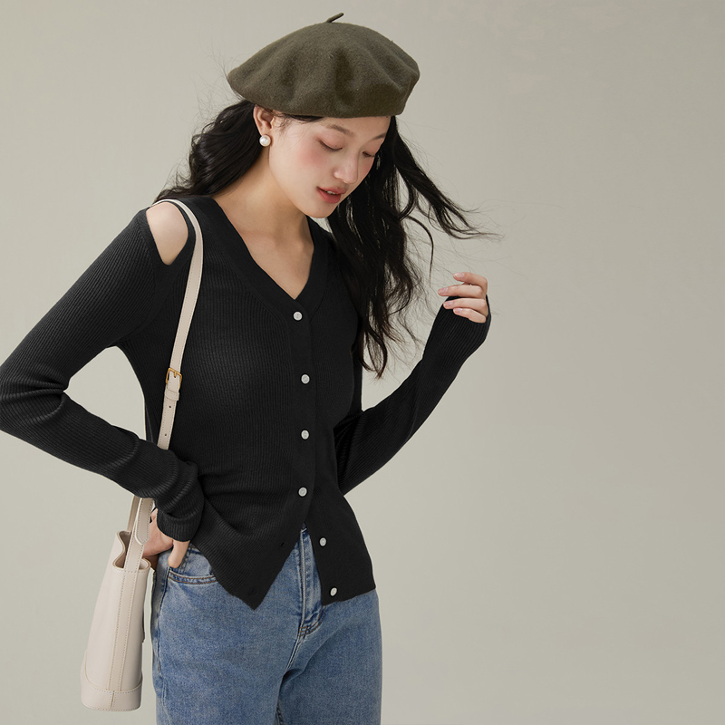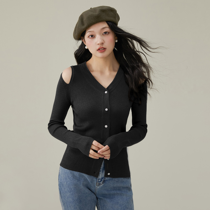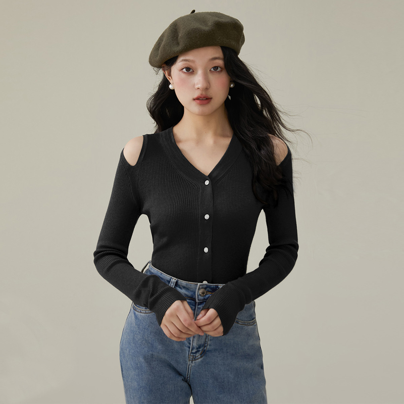 显瘦v领长袖 女修身 镂空打底上衣2025初秋 more高级露肩针织衫 one