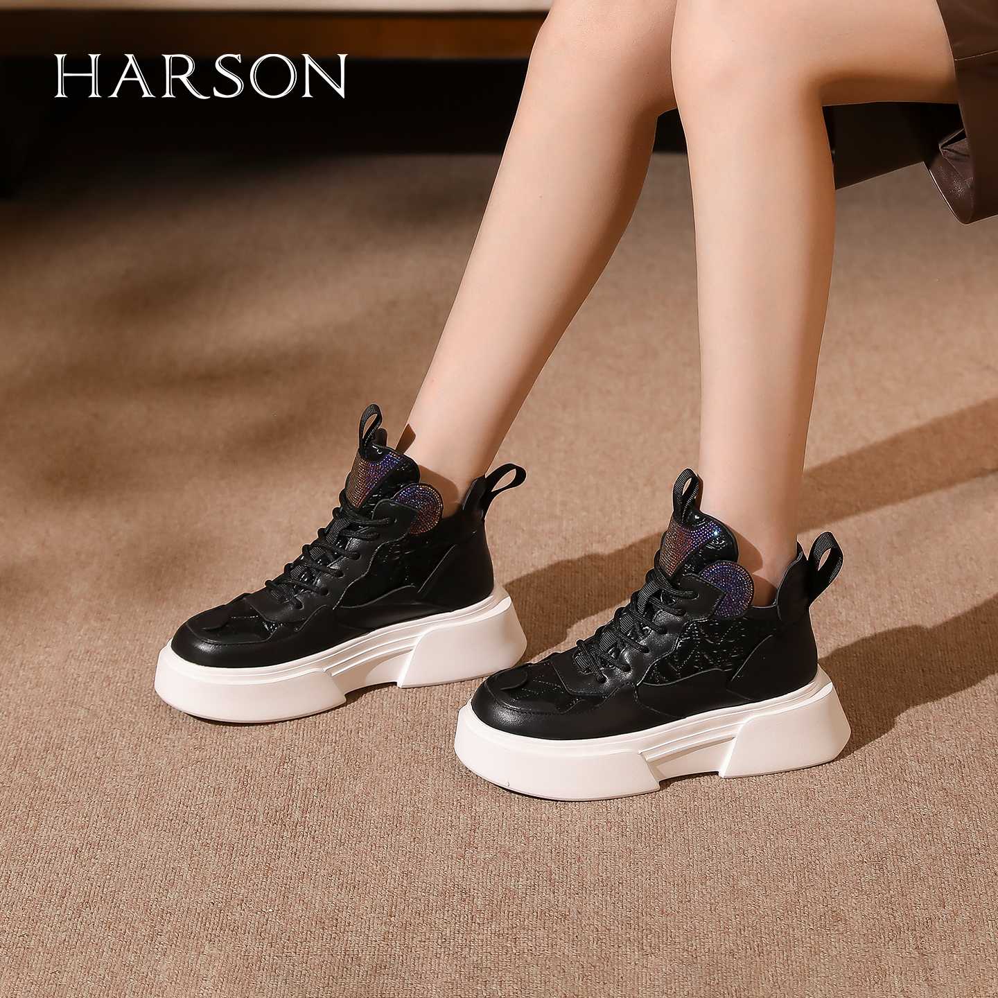 女鞋 哈森高帮鞋 秋冬牛皮革个性 女新款 HC230603 厚底休闲运动鞋