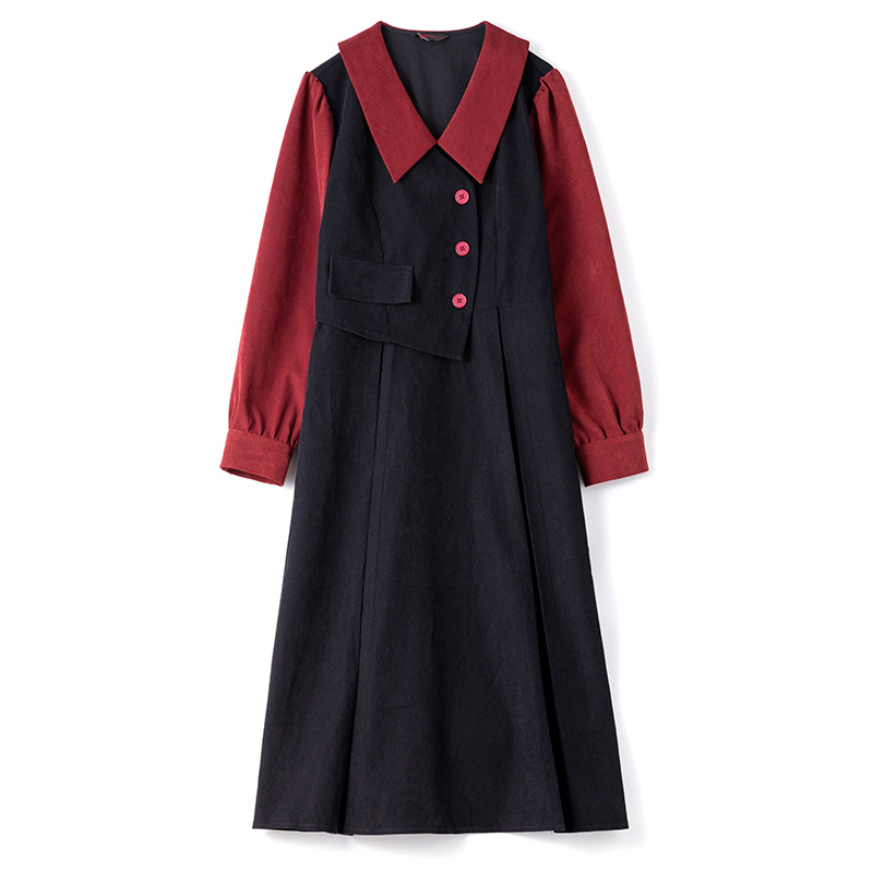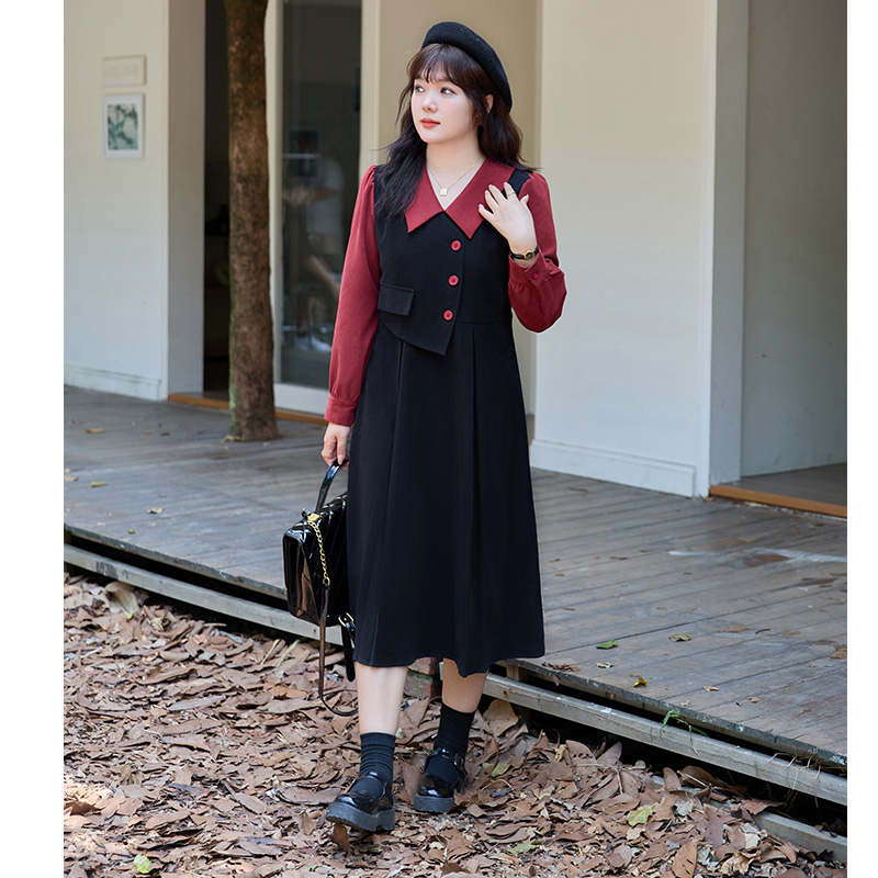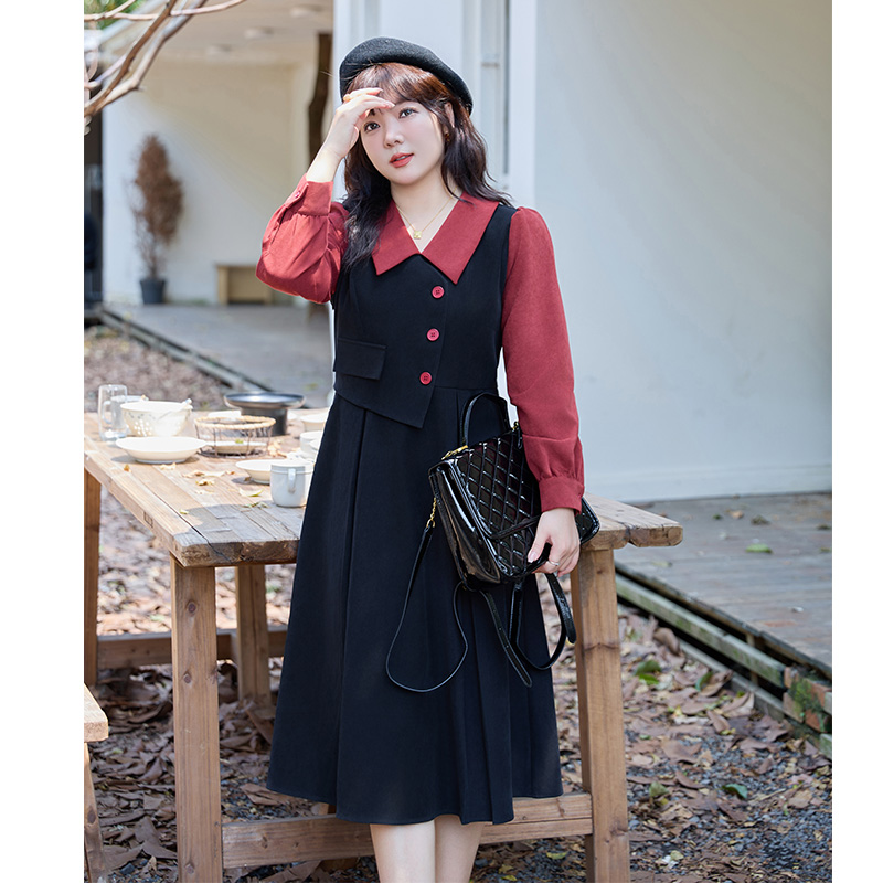收腰显瘦A字长裙秋冬新款 气质假两件套连衣裙微胖MM衬衫 法式 大码