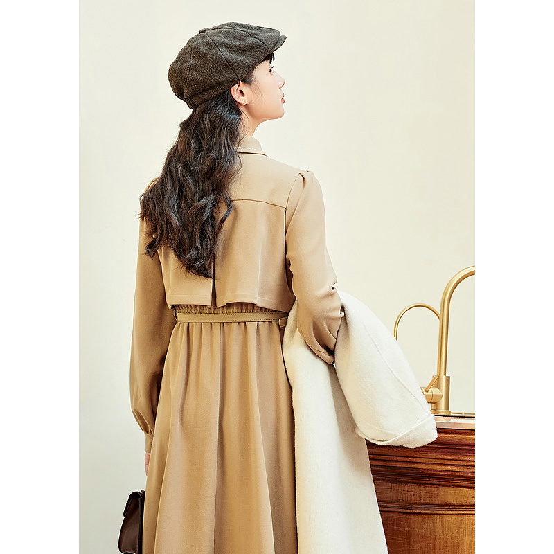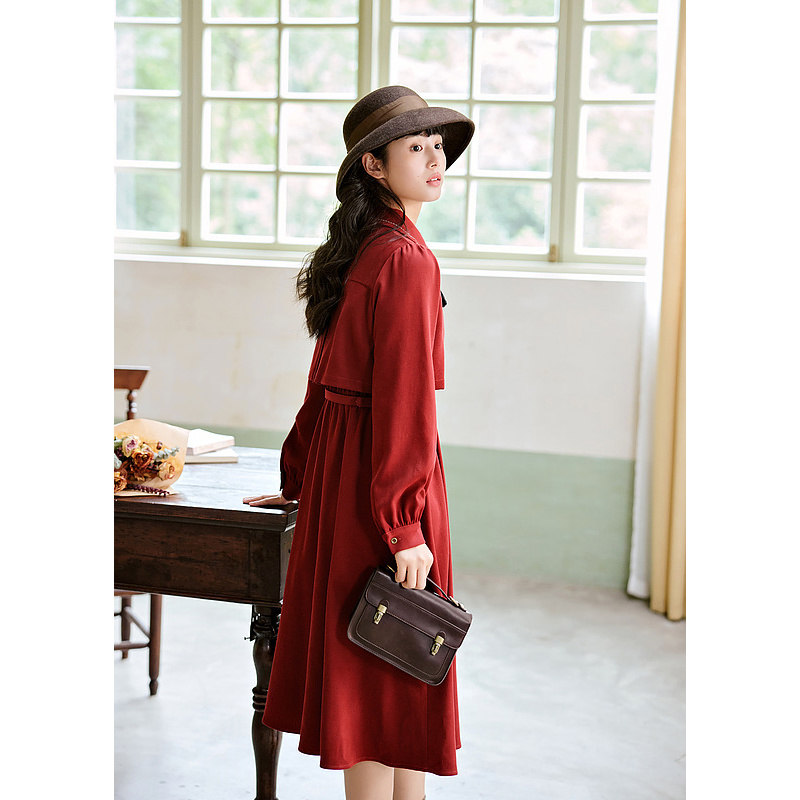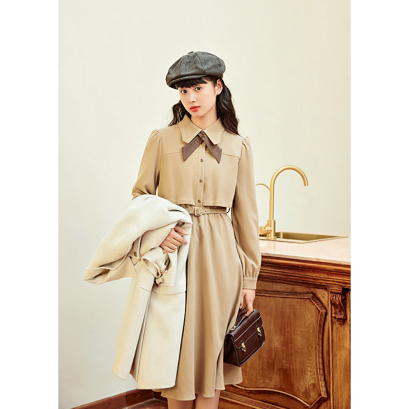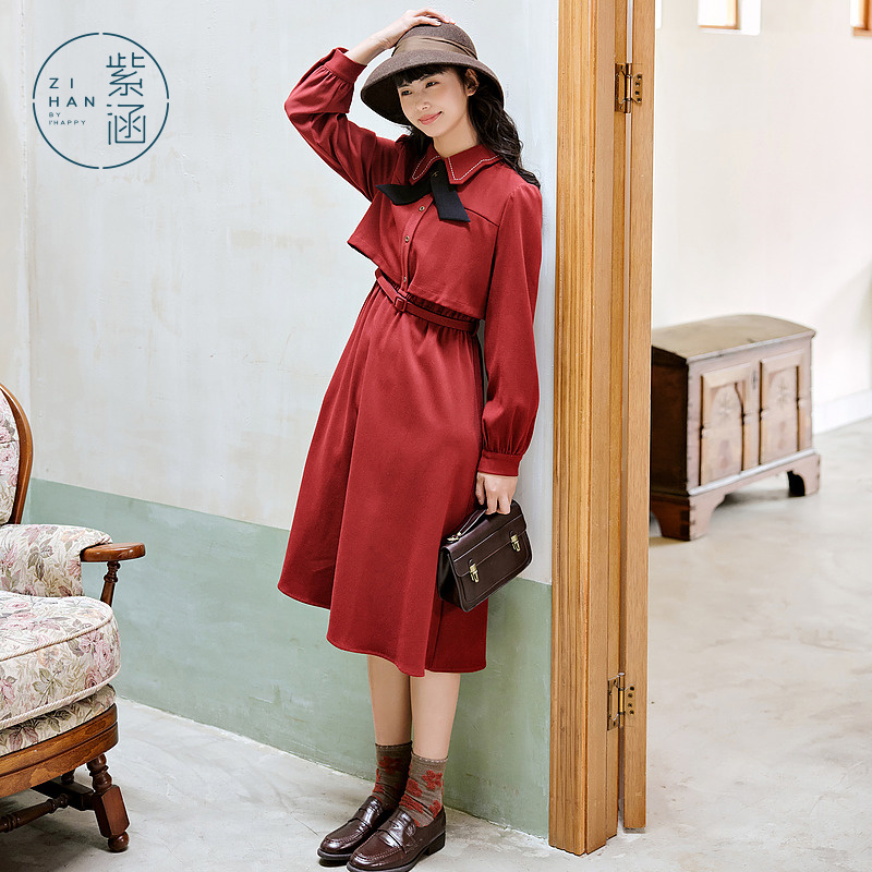 紫涵假两件收腰连衣裙女冬季 复古高腰显瘦大裙摆A字中长裙子 新款