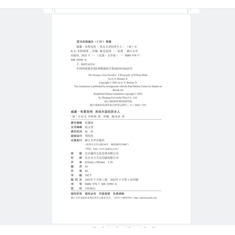 来自天堂 社新华书店正版 异乡人 小G.E.本特利文学家浙江大学出版 加 威廉.布莱克传