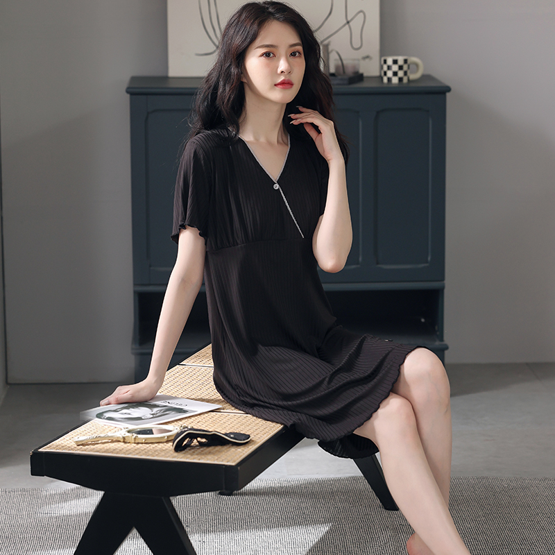 大码 长裙家居服夏款 条纹休闲可外穿 纯棉短袖 悦内睡裙女士睡衣夏季