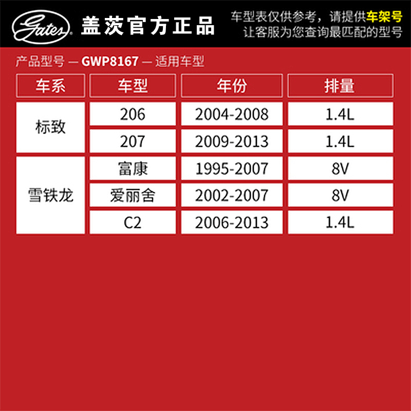 盖茨适配标致206 1.4发动机循环水泵 207雪铁龙C2爱丽舍富康8V