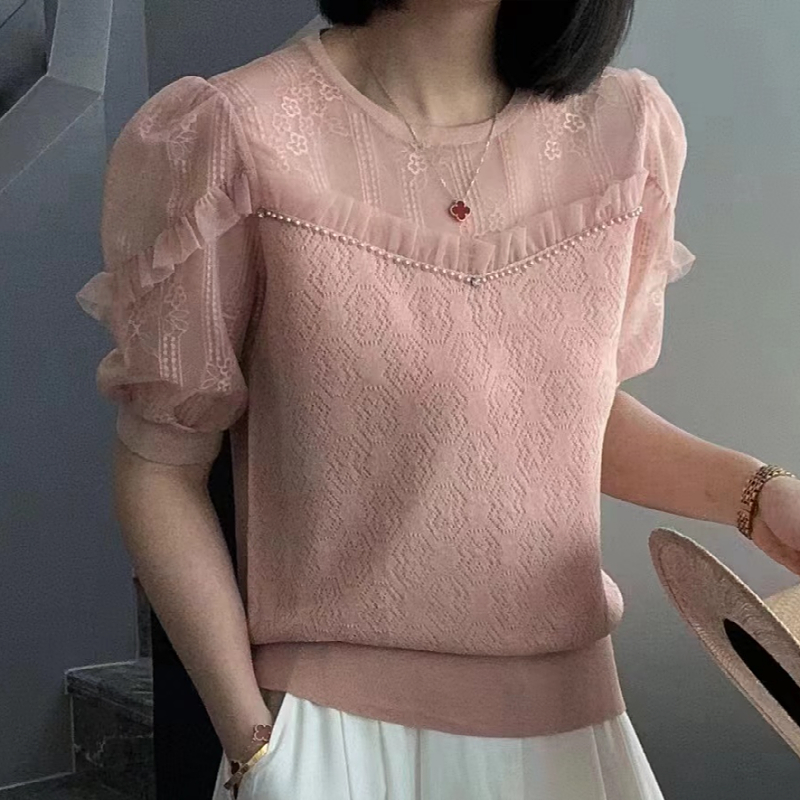 T恤 黑色上衣宽松遮肚圆领冰丝短袖 荷叶边拼接针织衫 女2025夏新款
