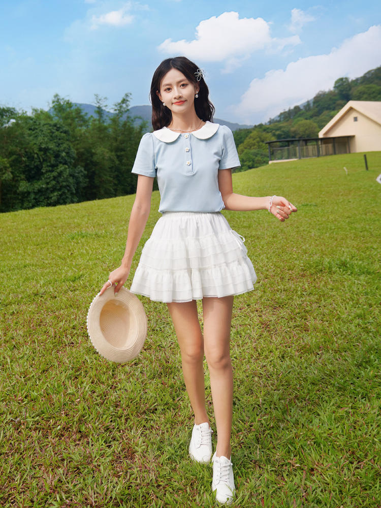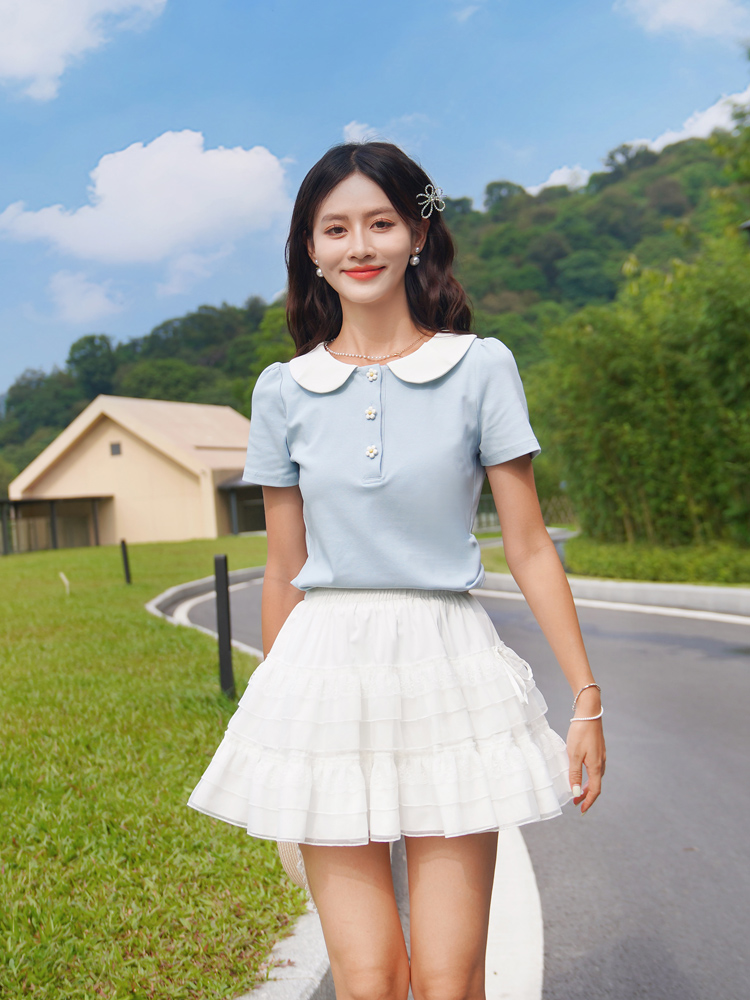 饰纯色上衣舒适透气款 ATAR小清新甜美娃娃领短袖 T恤女花朵扣子装