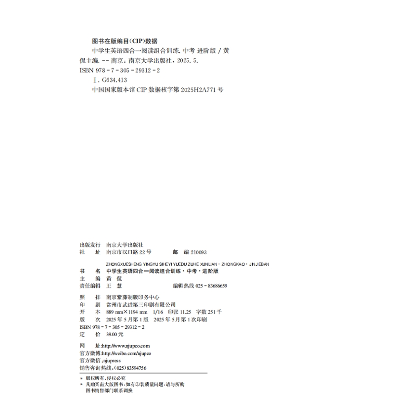 社新华书店正版 中学生英语四合一阅读组合训练 黄侃中学教辅南京大学出版 进阶版 中考