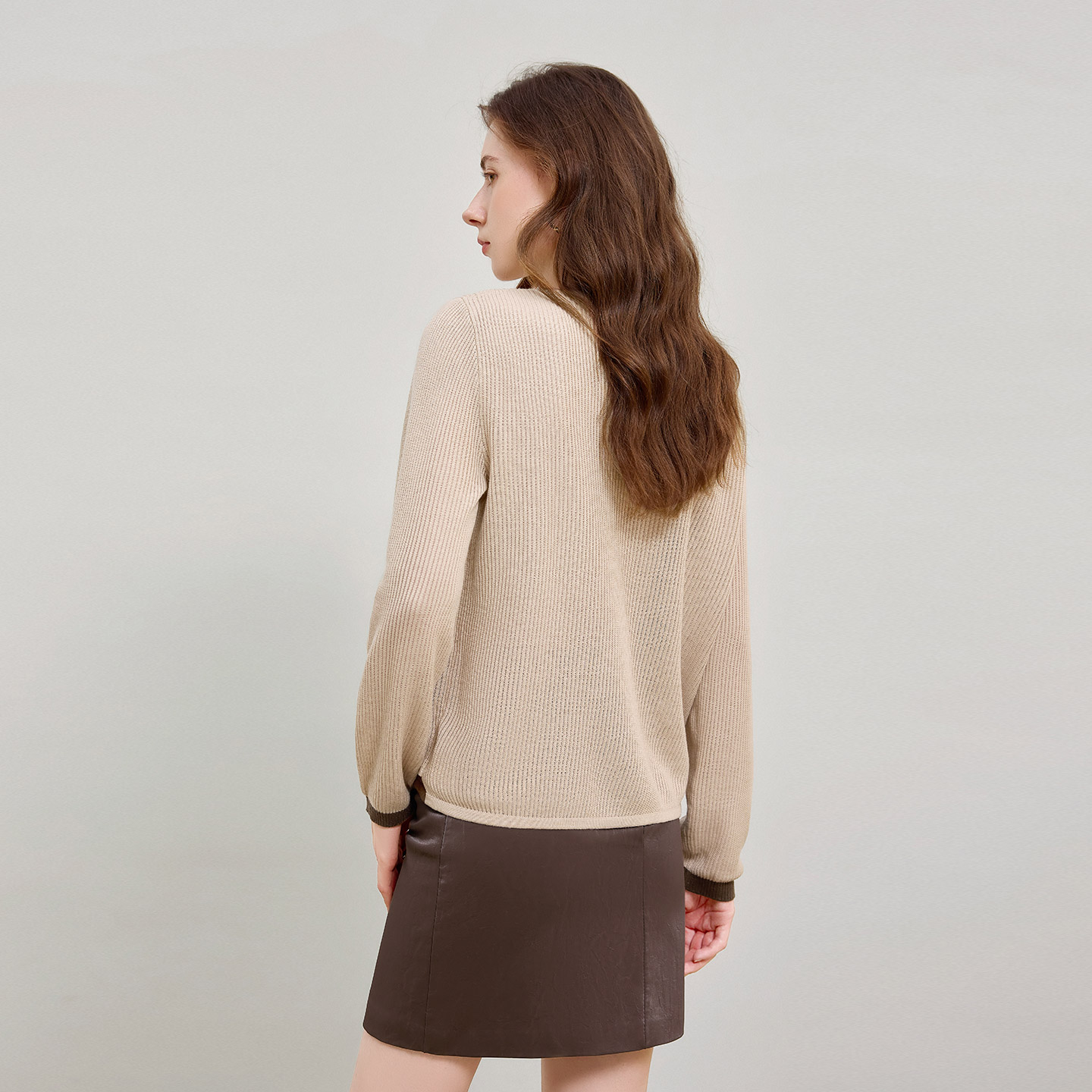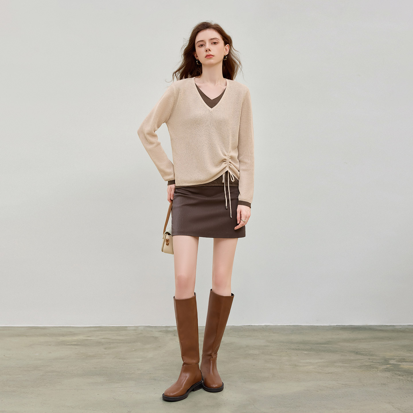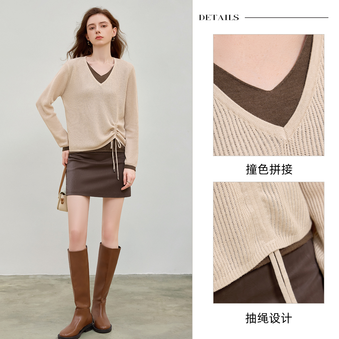 时尚 她池假两件针织衫 女装 新款 撞色V领抽绳套头正肩上衣 2025秋装