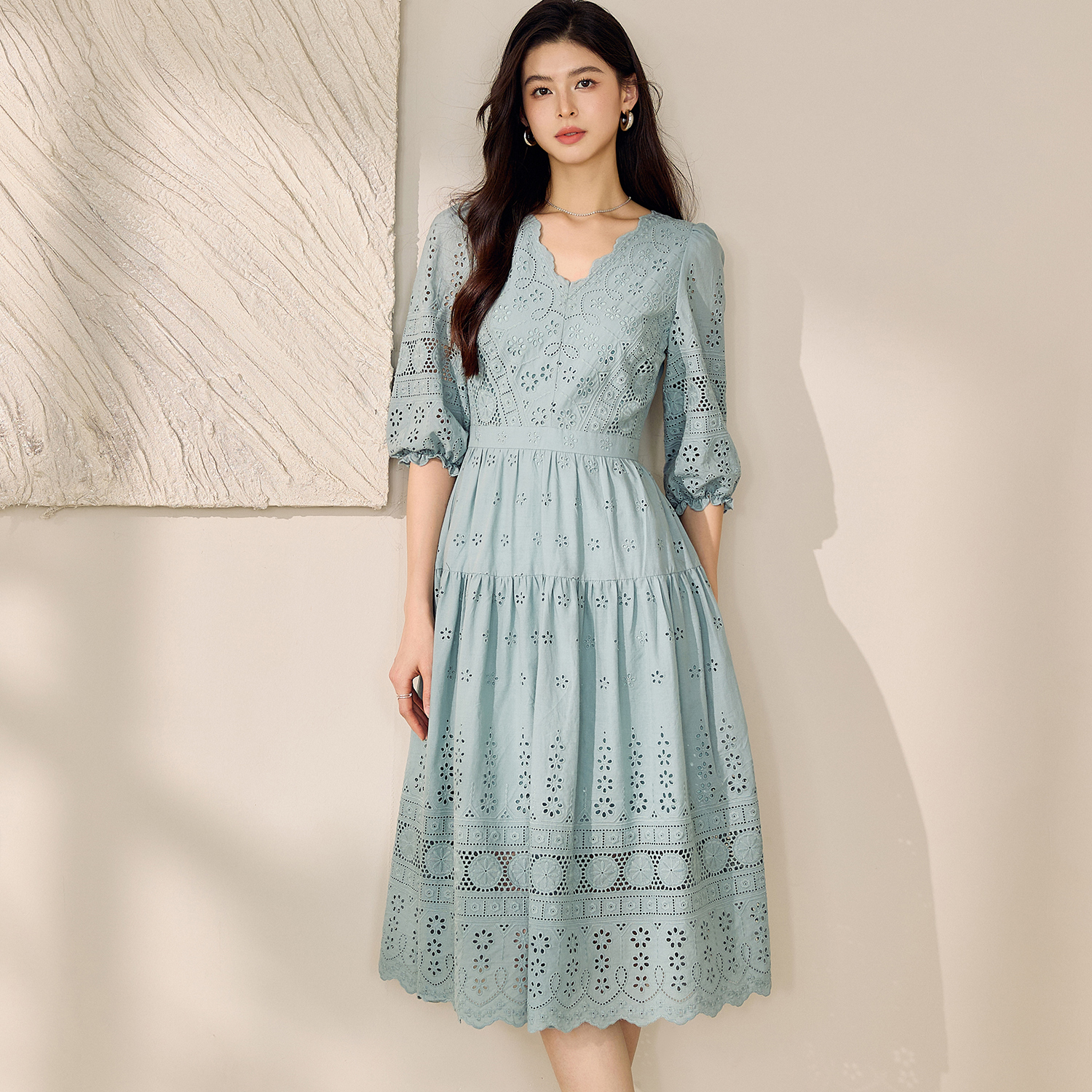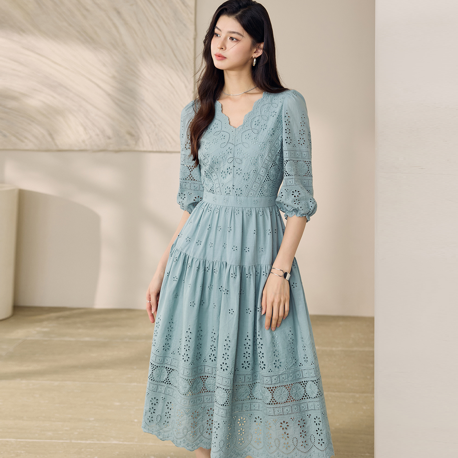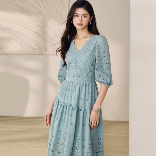 MAXRIENY浪漫复古U领鱼尾蕾丝连衣裙优雅裙 奥莱