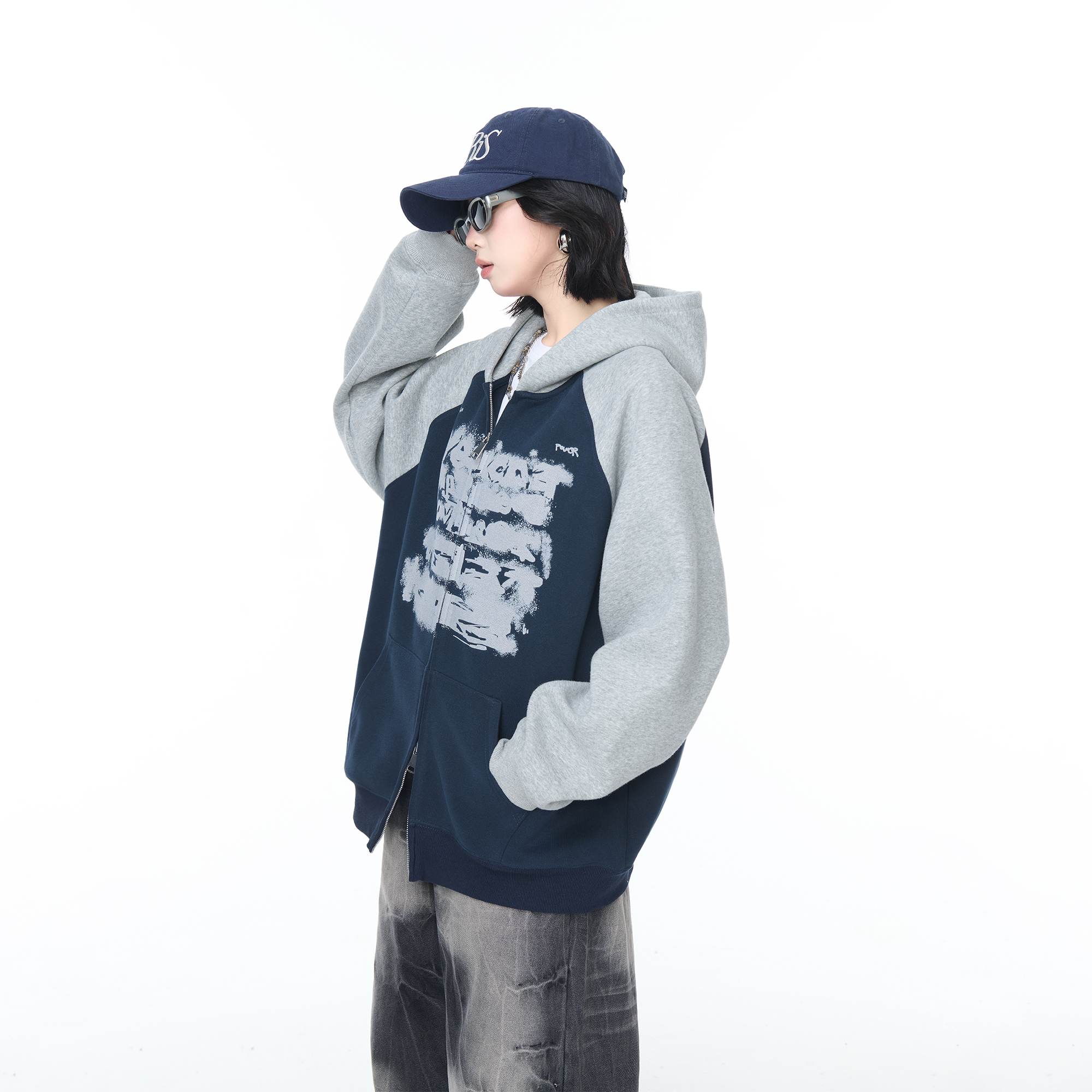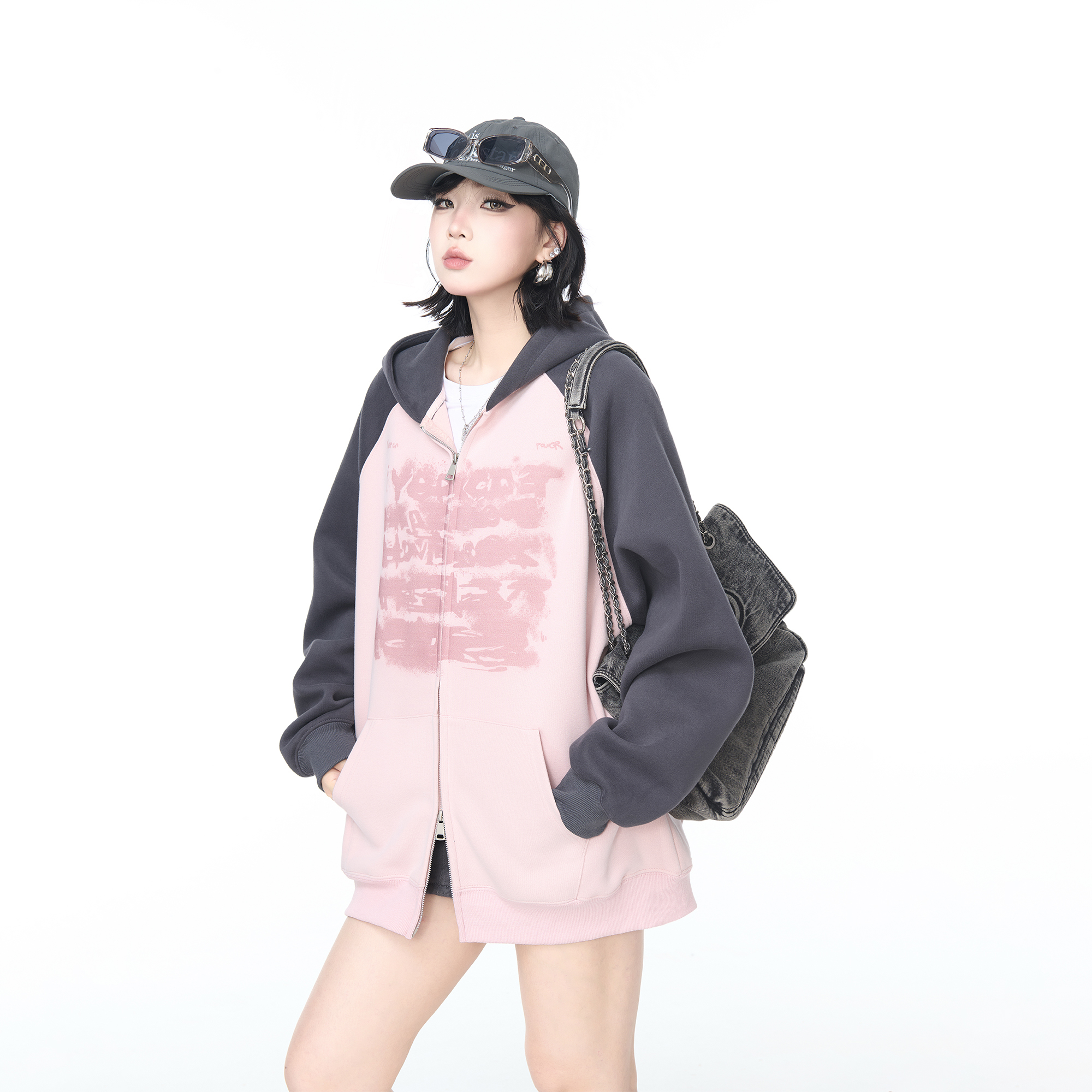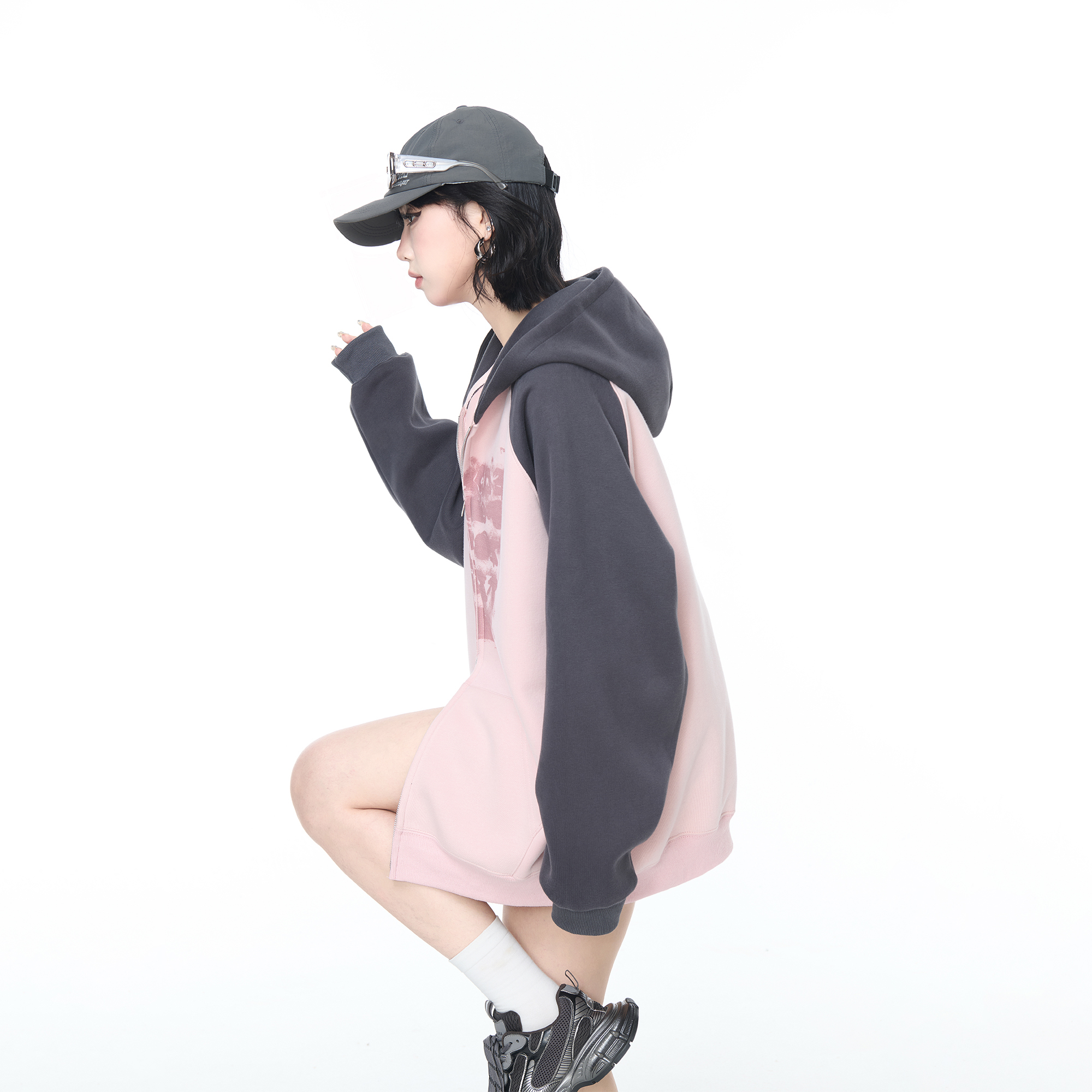 宽松上衣 连帽卫衣外套女春秋新款 美式 复古撞色拼接涂鸦印花开衫