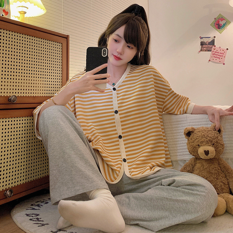 纯色全棉大码 猫人纯棉睡衣女春秋款 套装 长袖 宽松家居服 带胸垫开衫