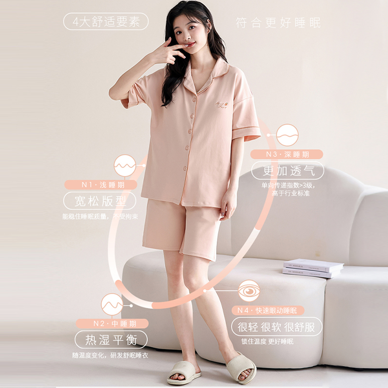 三件套夏季 家居服新款 薄款 简约大码 开衫 猫人带胸垫睡衣女纯棉短袖