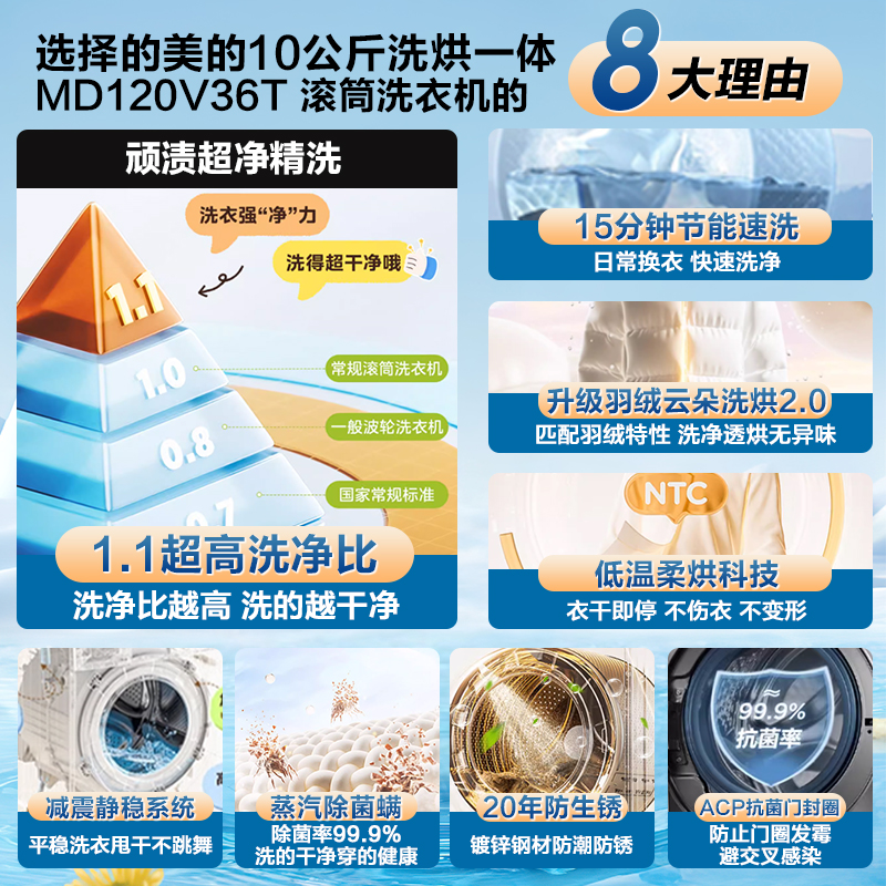 美 12kg公斤大容量家用除螨 洗衣机全自动洗脱烘干一体机滚筒10