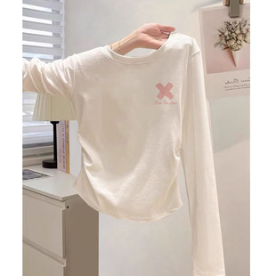 上衣T恤秋季 打底衫 收腰修身 白灰色美式 ins 显瘦短款 简约印花长袖