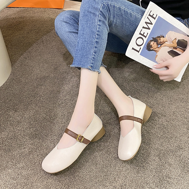 仙女风瓢鞋 秋季 浅口百搭中跟奶奶鞋 大码 真皮单鞋 女鞋 粗跟2025新款