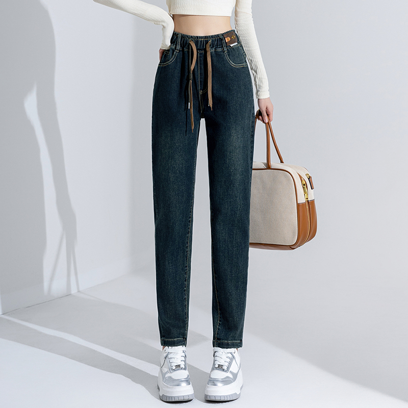 深蓝色学生小脚哈伦休闲老爹裤 新款 女2025年秋季 松紧腰弹力牛仔裤