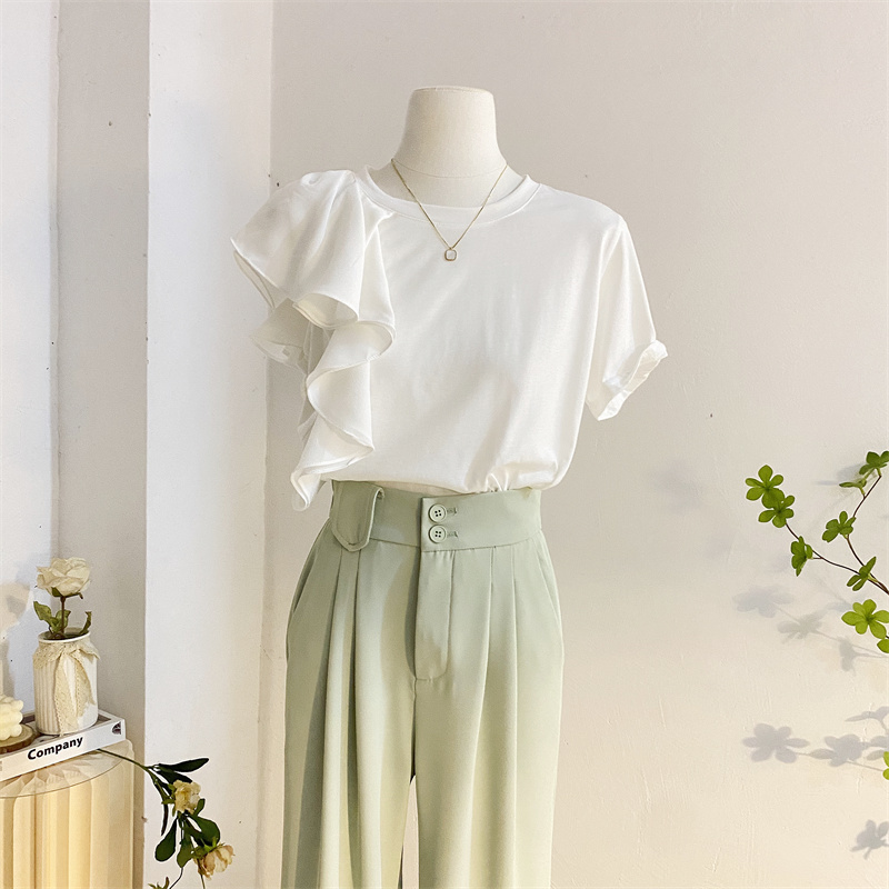 白色短袖 设计感小众宽松洋气不规则拼接荷叶边气质上衣 T恤女夏季