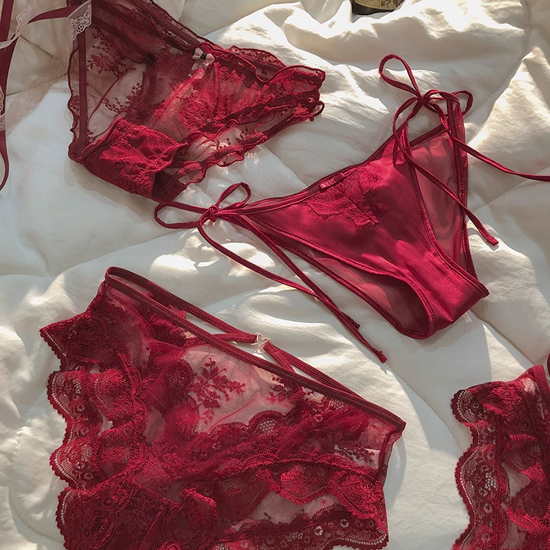 三角裤 内裤 性感蕾丝红内裤 设计镂空小众绑带本命年薄款 女红色法式