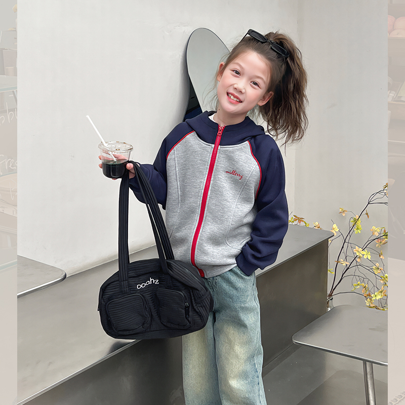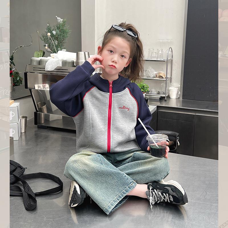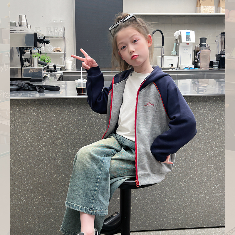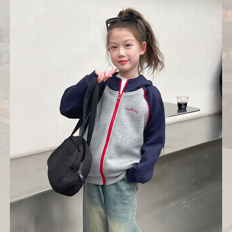 洋气上衣2025春秋新款 外套大童装 儿童连帽插肩袖 女童撞色运动开衫