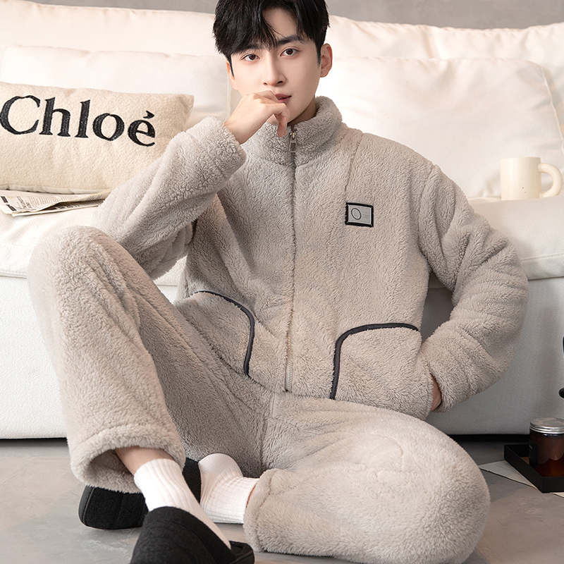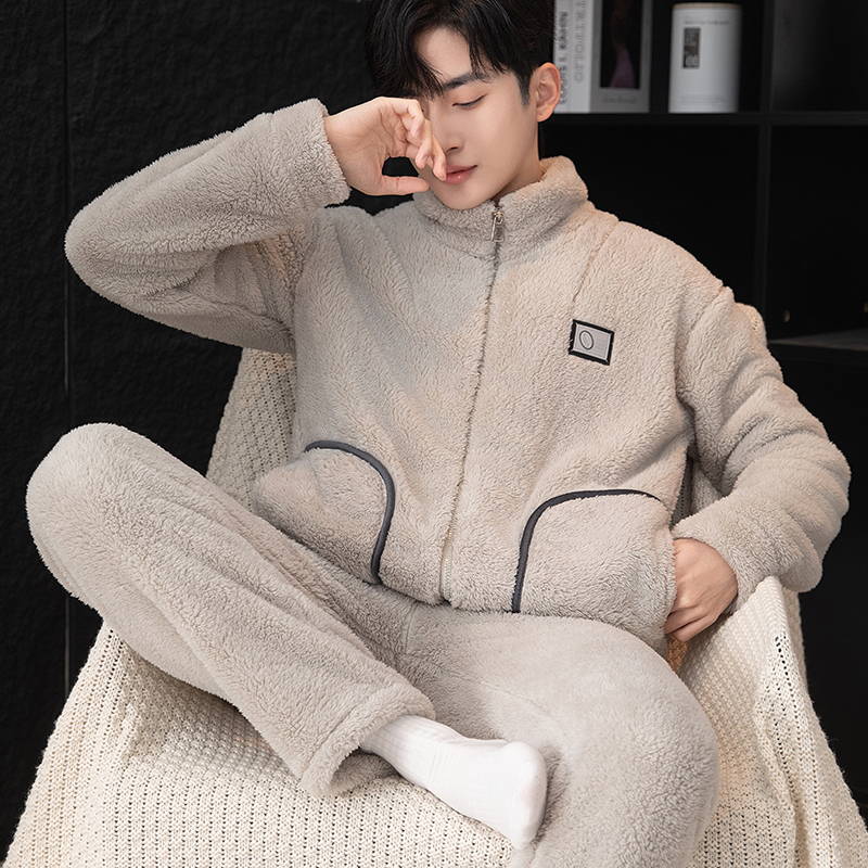 家居服套装 冬季 加绒加厚保暖北羔绒冬款 可外穿珊瑚绒睡衣男士 时尚
