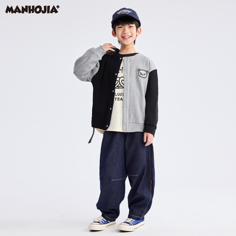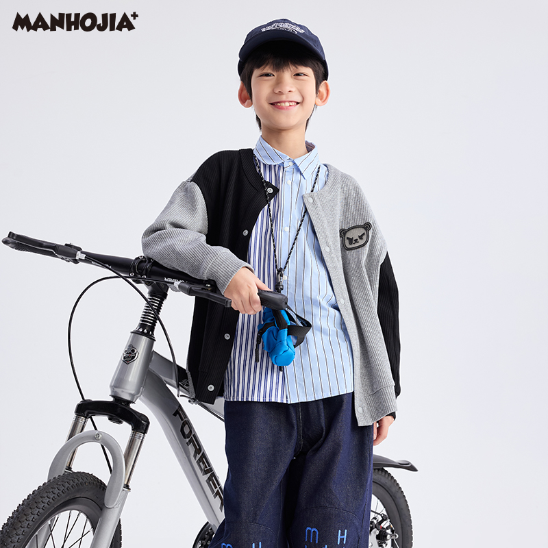 儿童外套25春秋不对称拼色圆领针织学院开衫 漫画家 格雷系学院