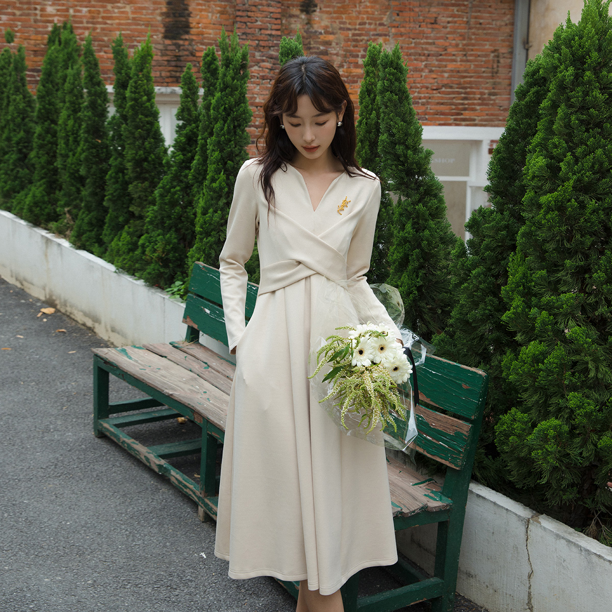 OCHIRLY欧时力 水溶棉V领针织连衣裙收腰A字软糯肌理感秋冬尖货