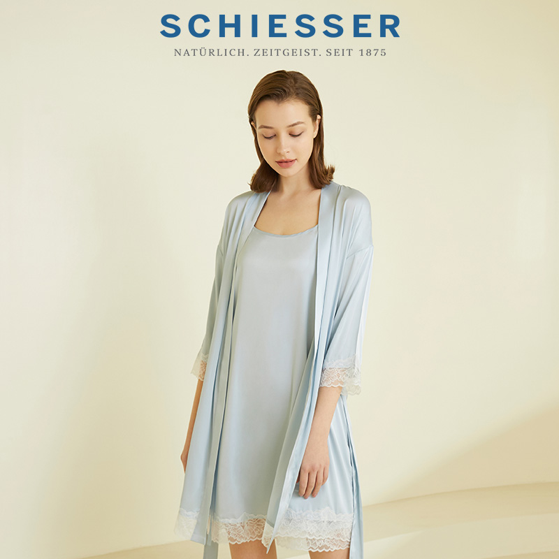 SCHIESSER舒雅奥莱女士50D缎面仿真丝雪纺蕾丝边家居系带睡袍