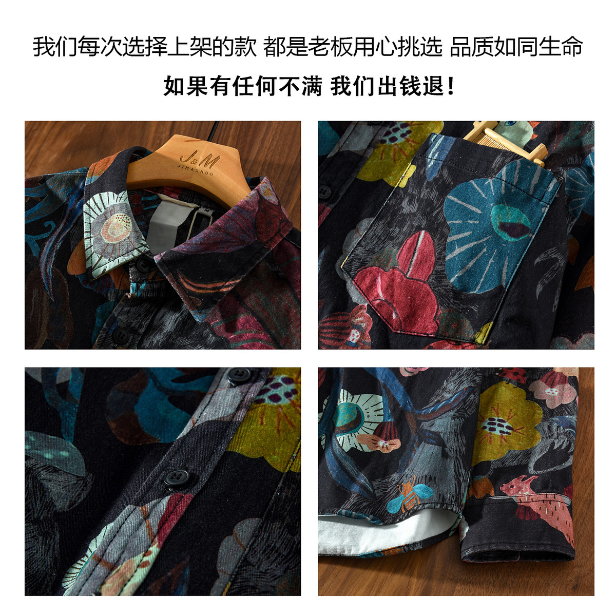 秋季 极麻个性 男士 衬衫 复古宽松青年百搭纯棉衬衣 印花撞色休闲长袖