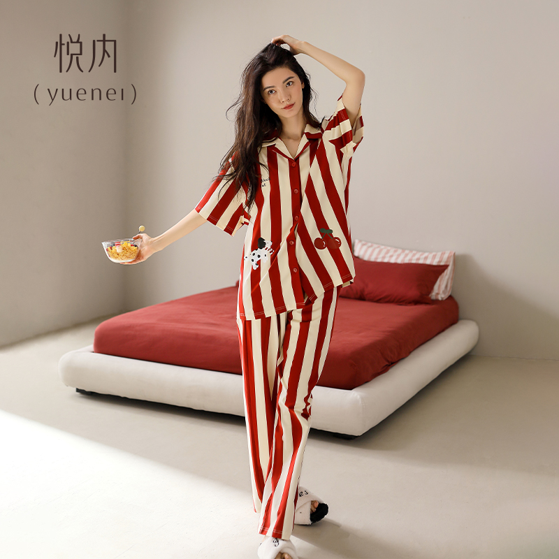 迪士尼纯棉条纹男家居服套装 款 果壳情侣睡衣女春秋新款 Gukoo