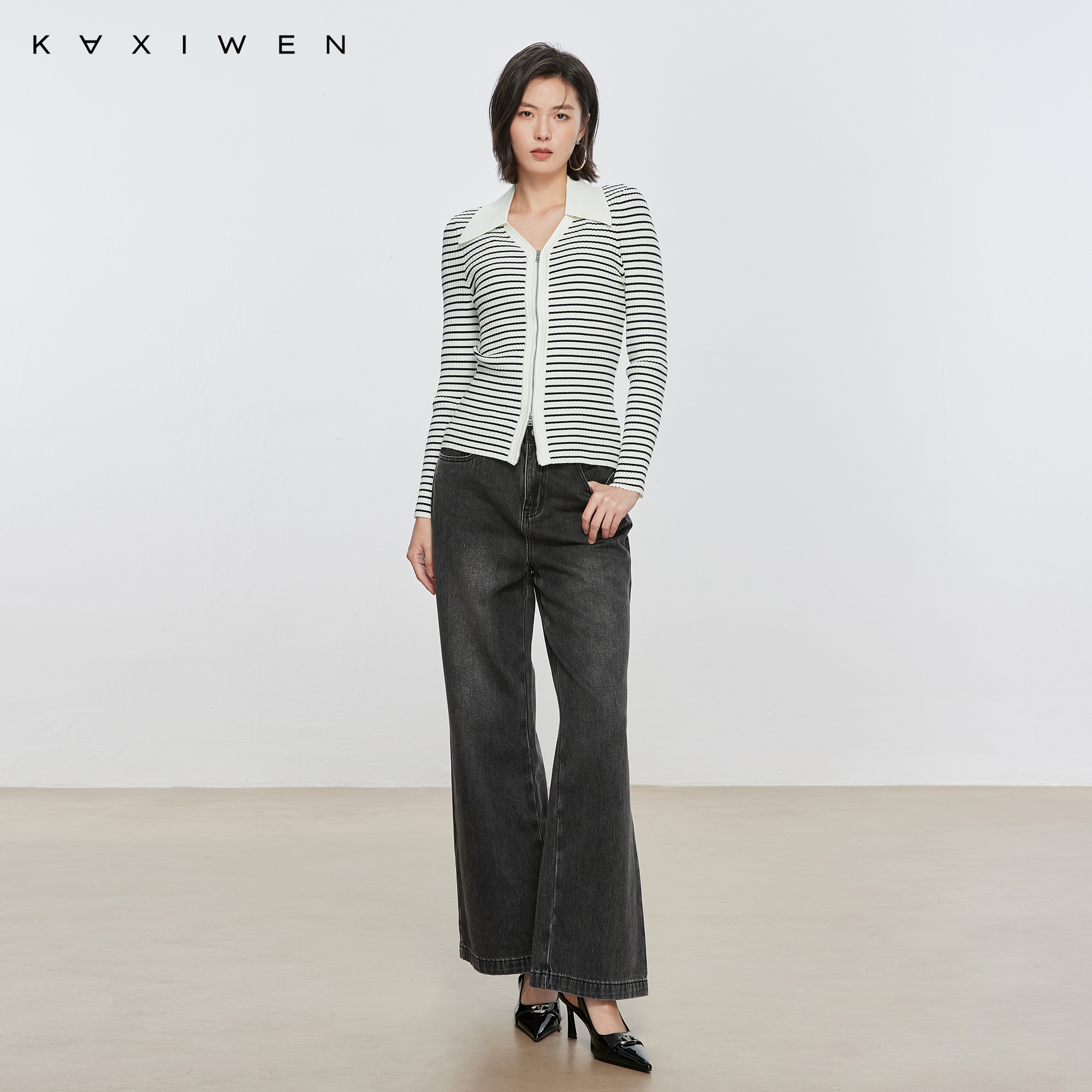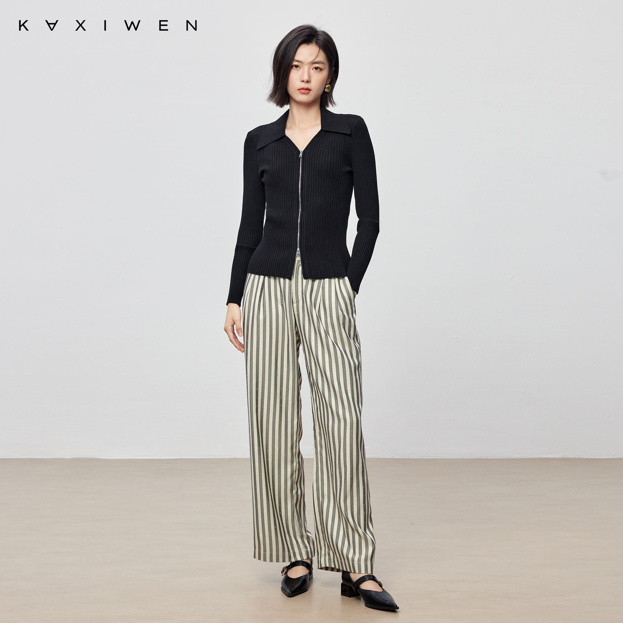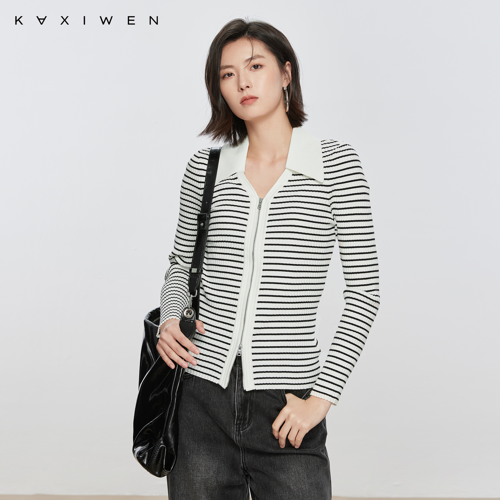 设计感V领双拉链长袖 佧茜文简约修身 新款 潮流秋季 上衣女 针织衫
