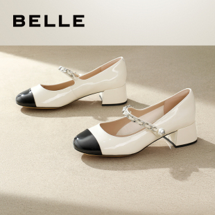 真皮浅口单鞋 新款 子E1T1DCQ5预 女2025秋季 百丽复古粗高跟玛丽珍鞋