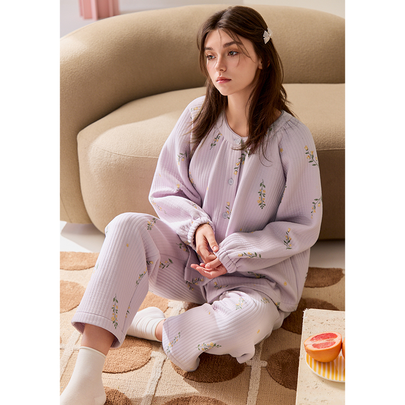 芬腾服饰10 保暖睡衣纯棉抗菌家居服 15°空气层夹棉秋冬女士长袖