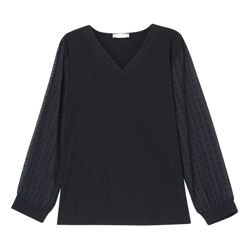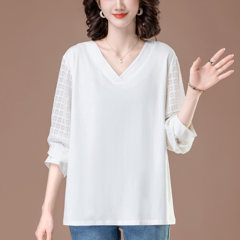 中年妈妈减龄休闲纯棉打底衫 V领长袖 女装 宽松加肥大码 T恤女春秋季