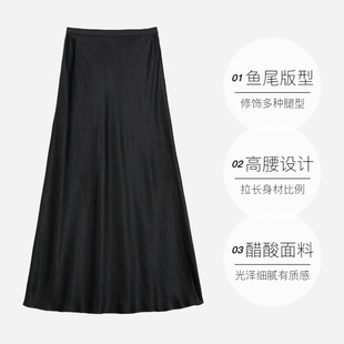 半身裙女2024夏新款 ELLE黑色长款 醋酸 高腰开叉鎏光裙 自营
