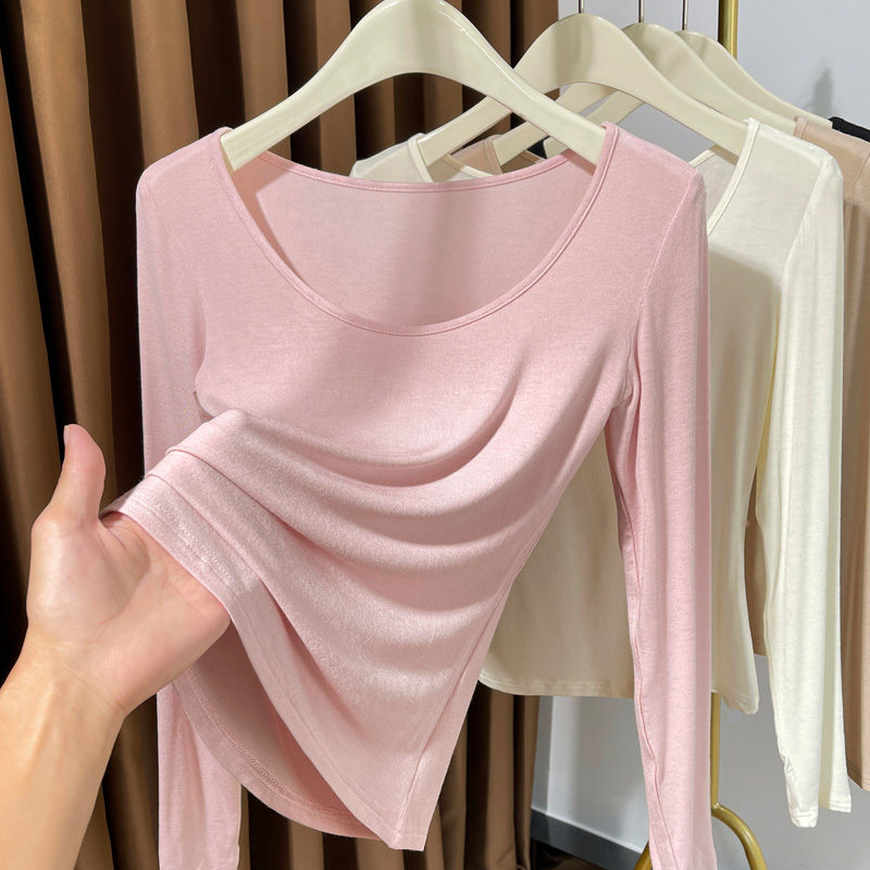 莫代尔t恤长袖 黑色低领内搭超薄打底衫 修身 大圆领薄款 女春秋新款