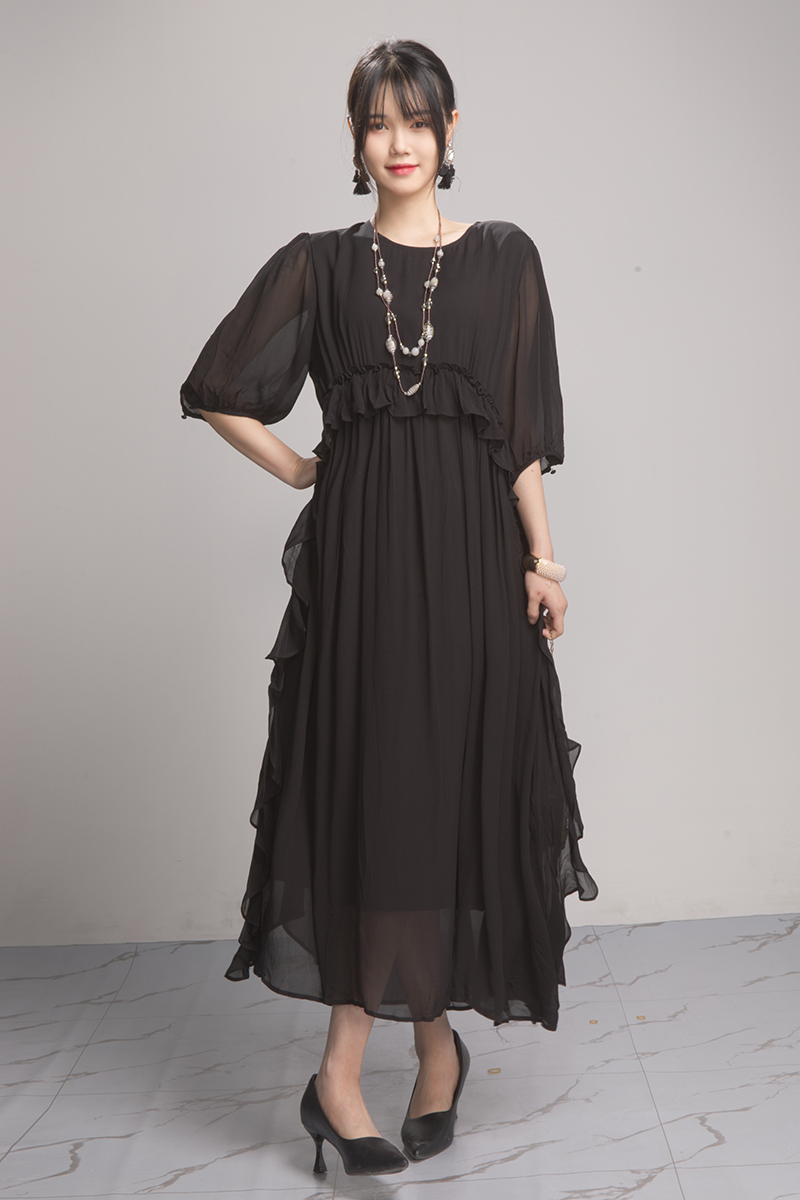 时尚 2025秋季 大摆长裙宽松大码 女连衣裙雪纺拼接荷叶边灯笼袖 新款