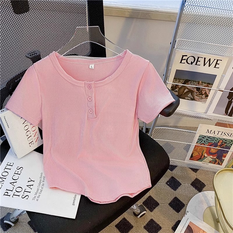 t恤女夏 正肩短袖 纽扣设计感短款 小个子纯欲螺纹上衣u领锁骨修身