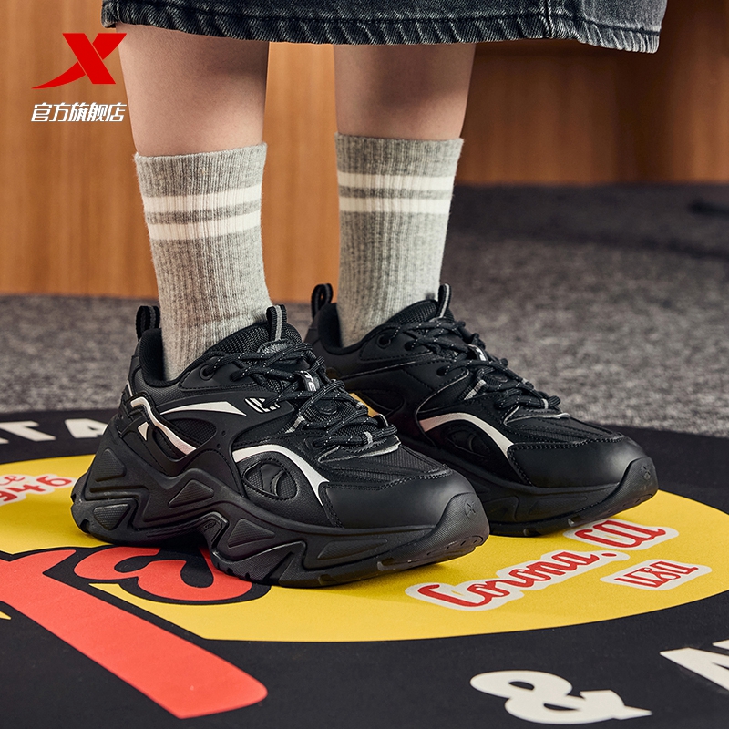 女软底学生百搭厚底增高休闲鞋 特步司康鞋 黑色运动鞋 2025新款 女鞋