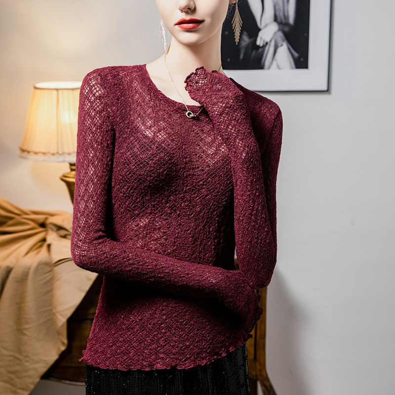 女纯色2025秋季 上衣小衫 新款 长袖 内搭女装 圆领镂空性感蕾丝打底衫