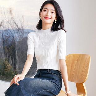内搭上衣中袖 大码 毛衣女短袖 针织打底衫 t恤胖mm春秋 半高领五分袖