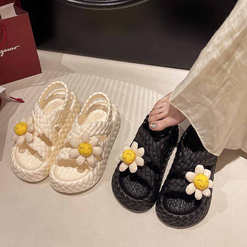 外穿厚底防滑罗马风沙滩鞋 网红时尚 女士夏季 可爱笑脸花朵编织凉鞋