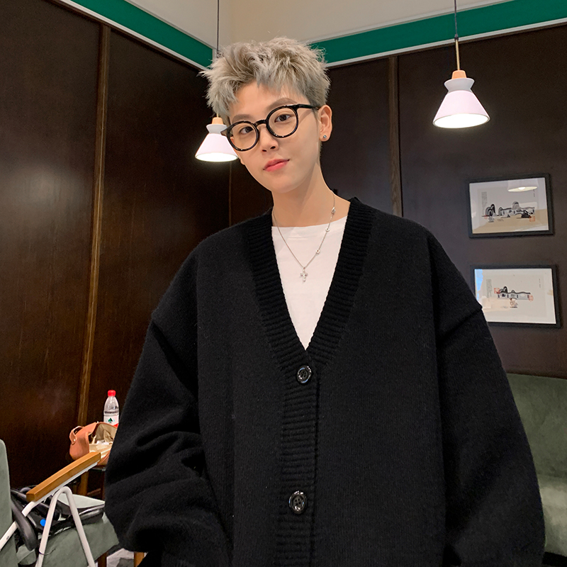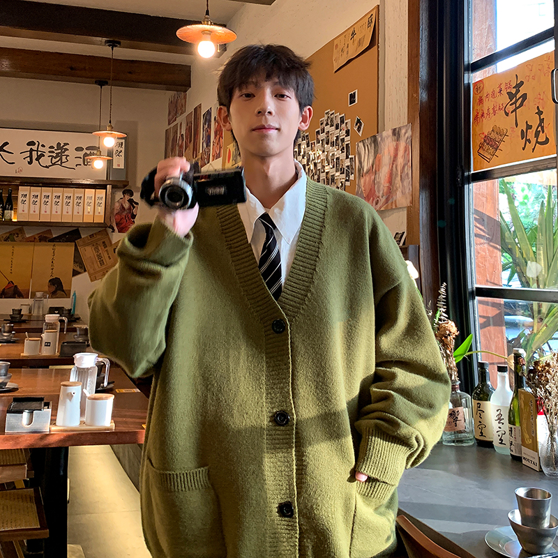 潮牌宽松外穿线衣外套 日系复古慵懒风针织衫 V领开衫 毛衣男秋冬季