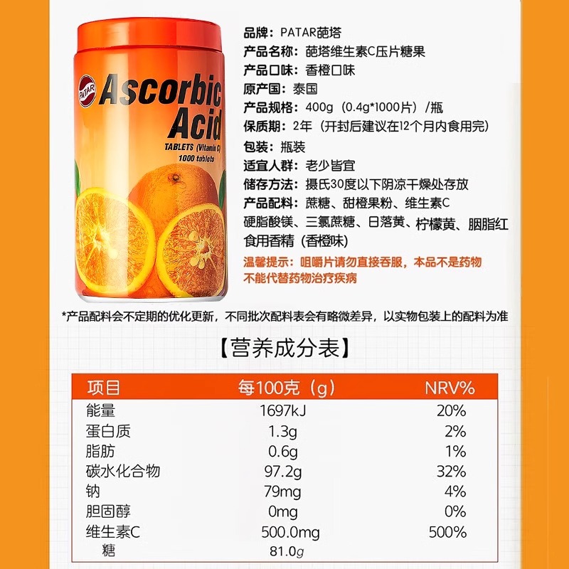 泰国patar进口维生素C咀嚼片vc成人儿童增强抵抗免疫含片 自营