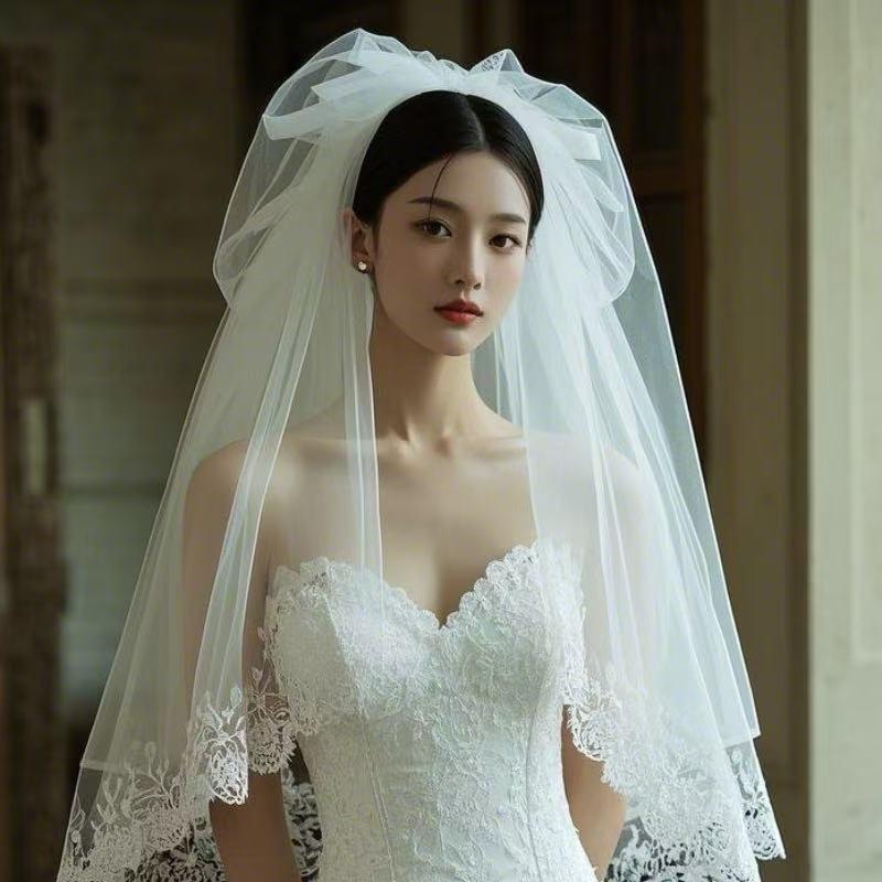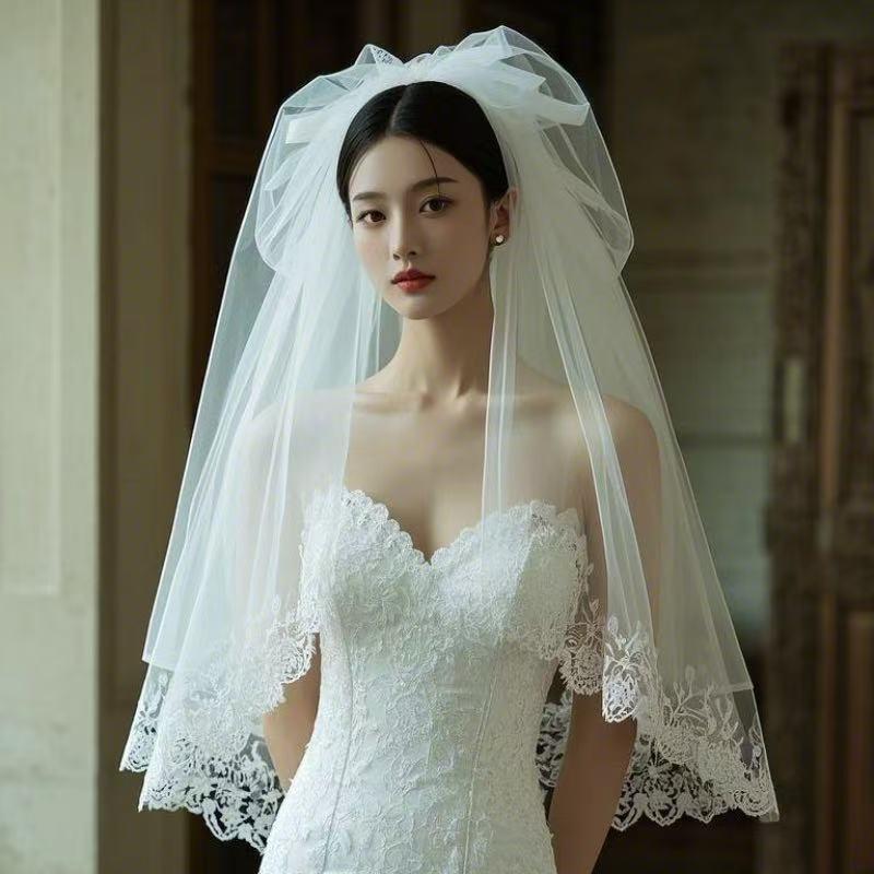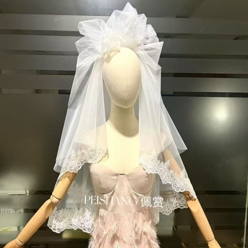 佩赏新娘头纱韩式 提升纱结婚照礼服配饰 蕾丝花边软纱双层蓬蓬短款